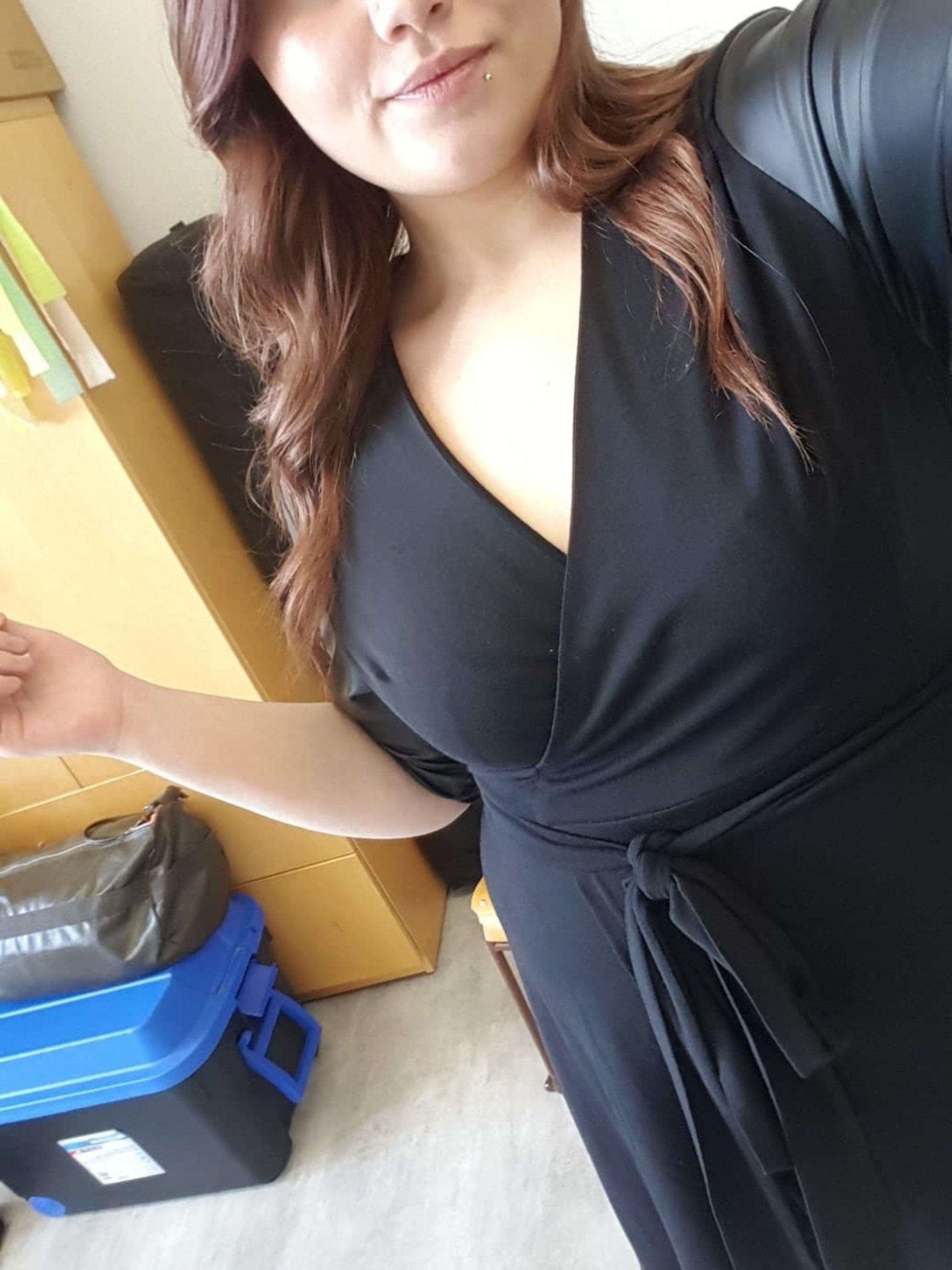 Black wrap dress made out of jersey knit, sleeves are pleather