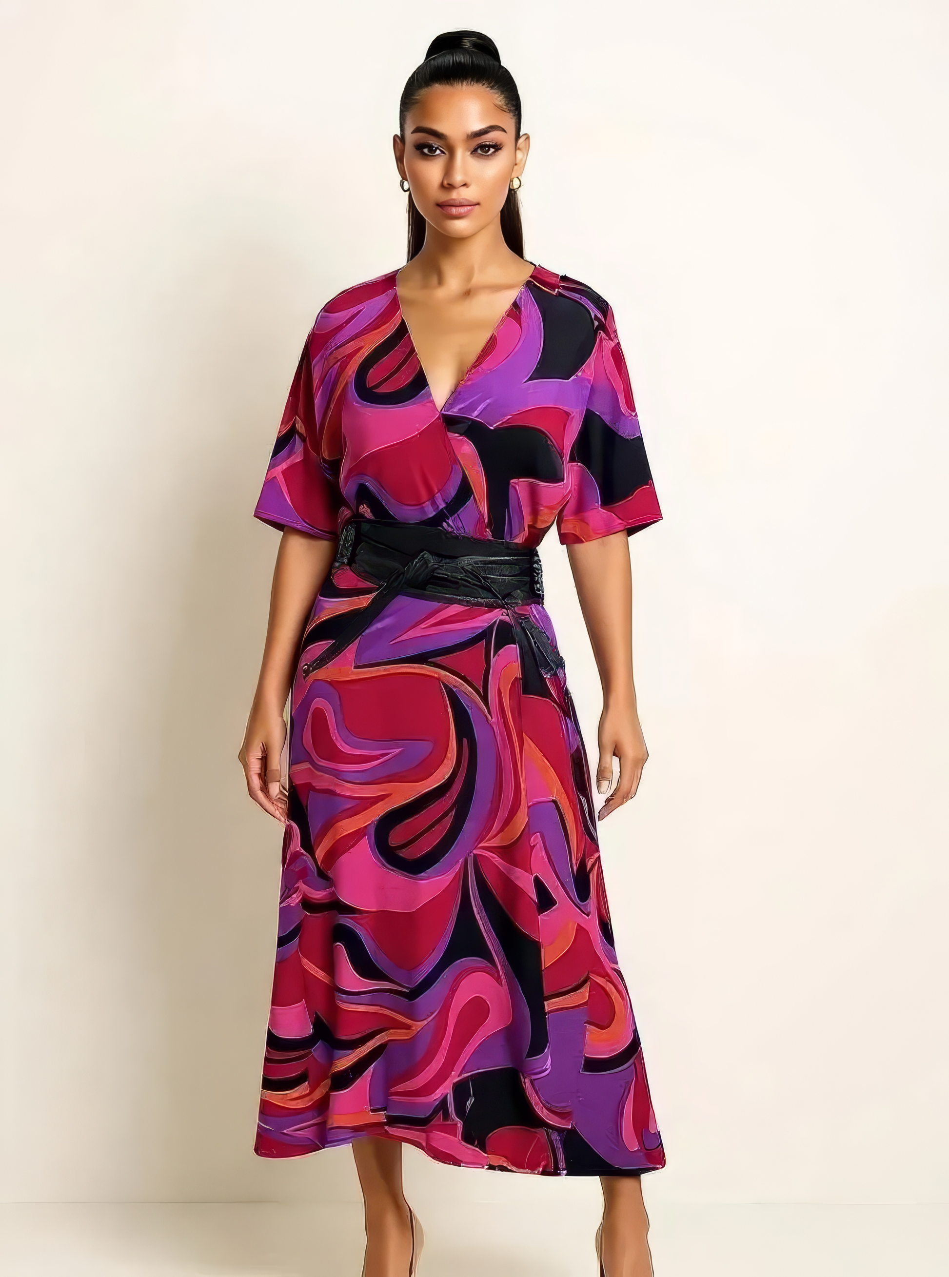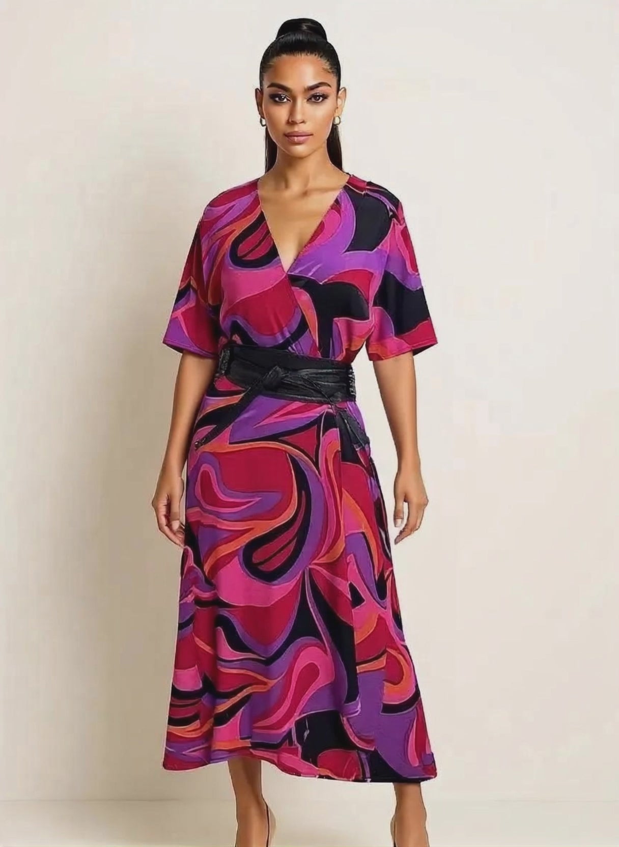 Bold and unapologetic, this kimono radiates confidence with its striking swirls of magenta, crimson, and deep violet. Versatile enough to be worn as a robe or styled as a dress, it adapts to any mood or moment. Note: belt not included, sold separately